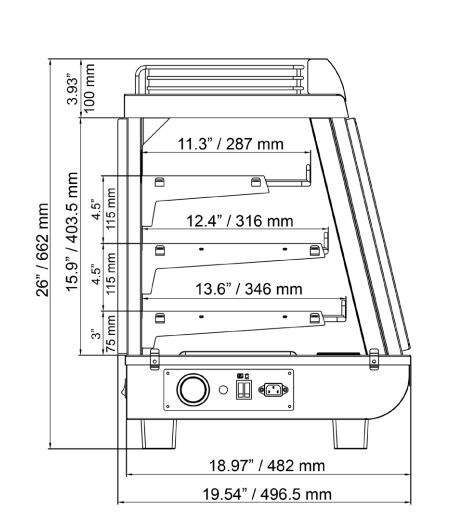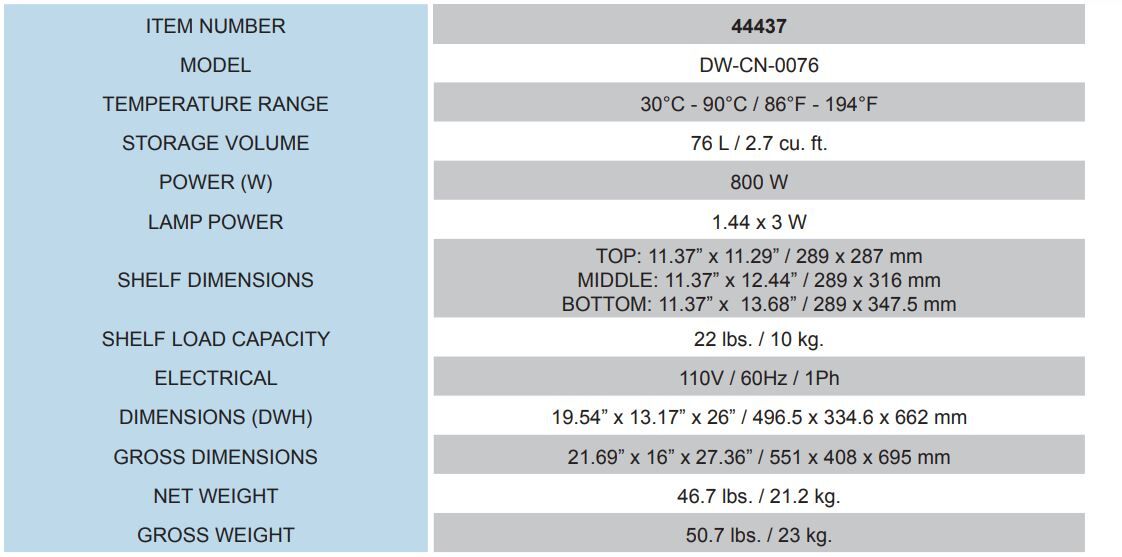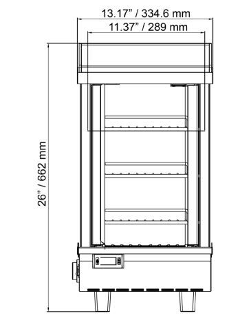 The 13-inch Display Warmer with 76 L capacity (Model 44437) is an essential addition for any foodservice operation looking to enhance visibility and maintain food safety. Designed to boost impulse sales, this countertop warmer features adjustable chrome-plated shelves and a front-hinged door for easy access. Its brilliant internal LED illumination ensures your food items are attractively displayed while keeping them at safe temperatures. With a capacity of 76 liters (2.6 cu. ft.), it provides ample space for a variety of dishes, making it perfect for cafes, buffets, or catering services.