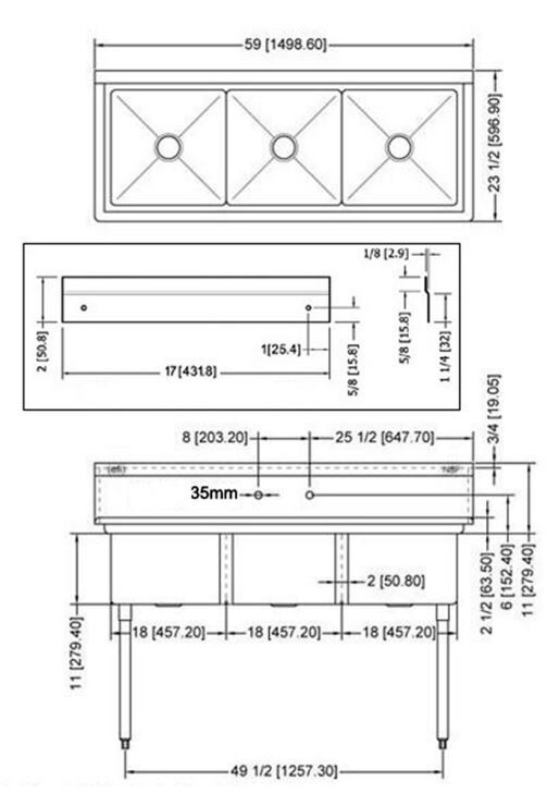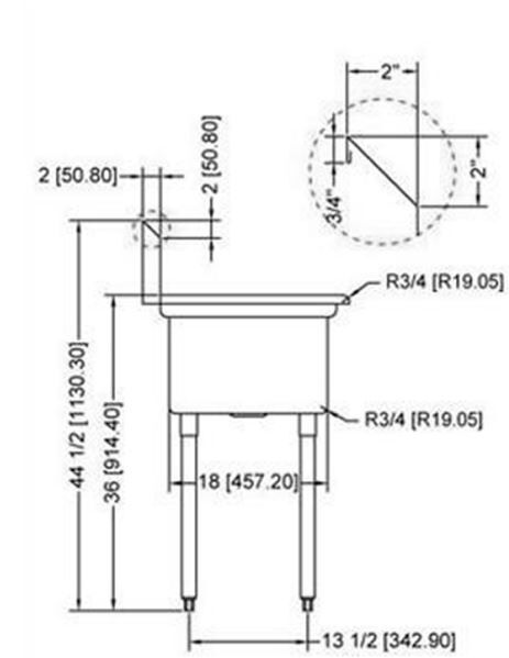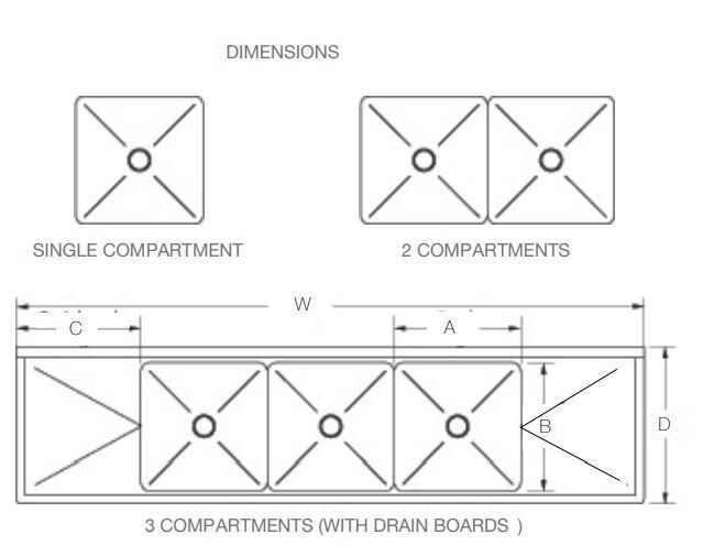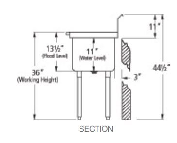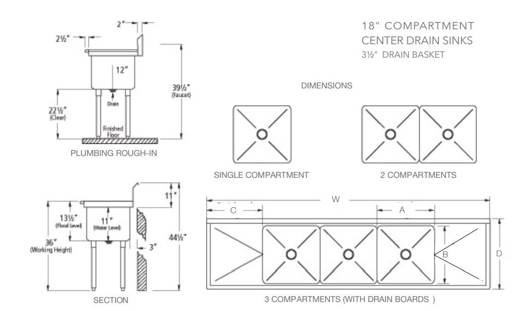 18″ x 18″ x 13″ Economy Center Drain Three Compartment Sink with No Drain Board SI818-3NC Features: