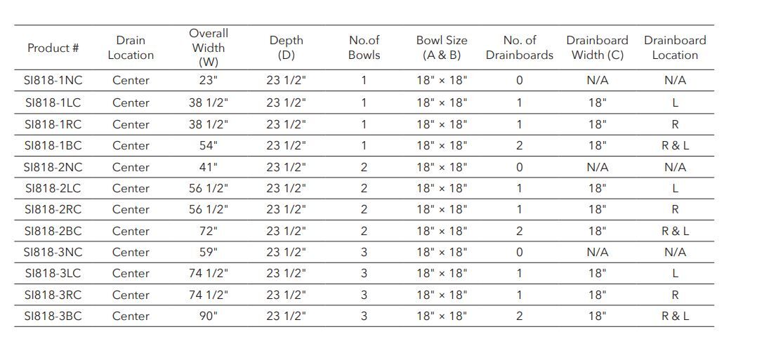 • Center drain sinks have 3.” drain holes and come with a drain basket.