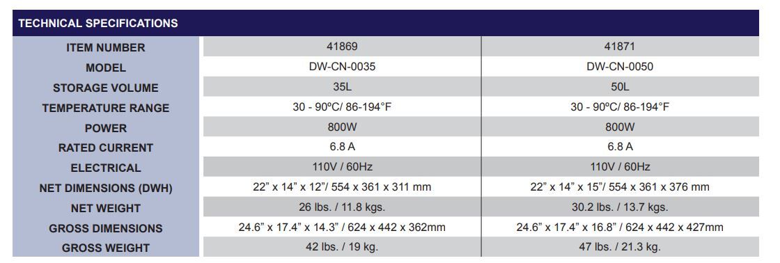 35 L, 800 WATTS, 30 – 90ºC/ 86-194°F , 110V/60Hz/1Ph