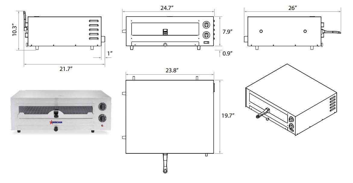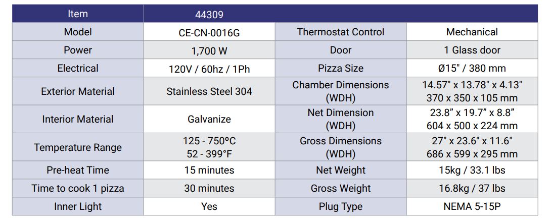 24″ Single Chamber Electric Pizza Oven with Glass Door for 16″ Pizza – 120V, 1700W 44309 Features: