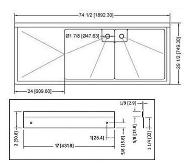 • Center drain sinks have 3.” drain holes and come with a drain basket.