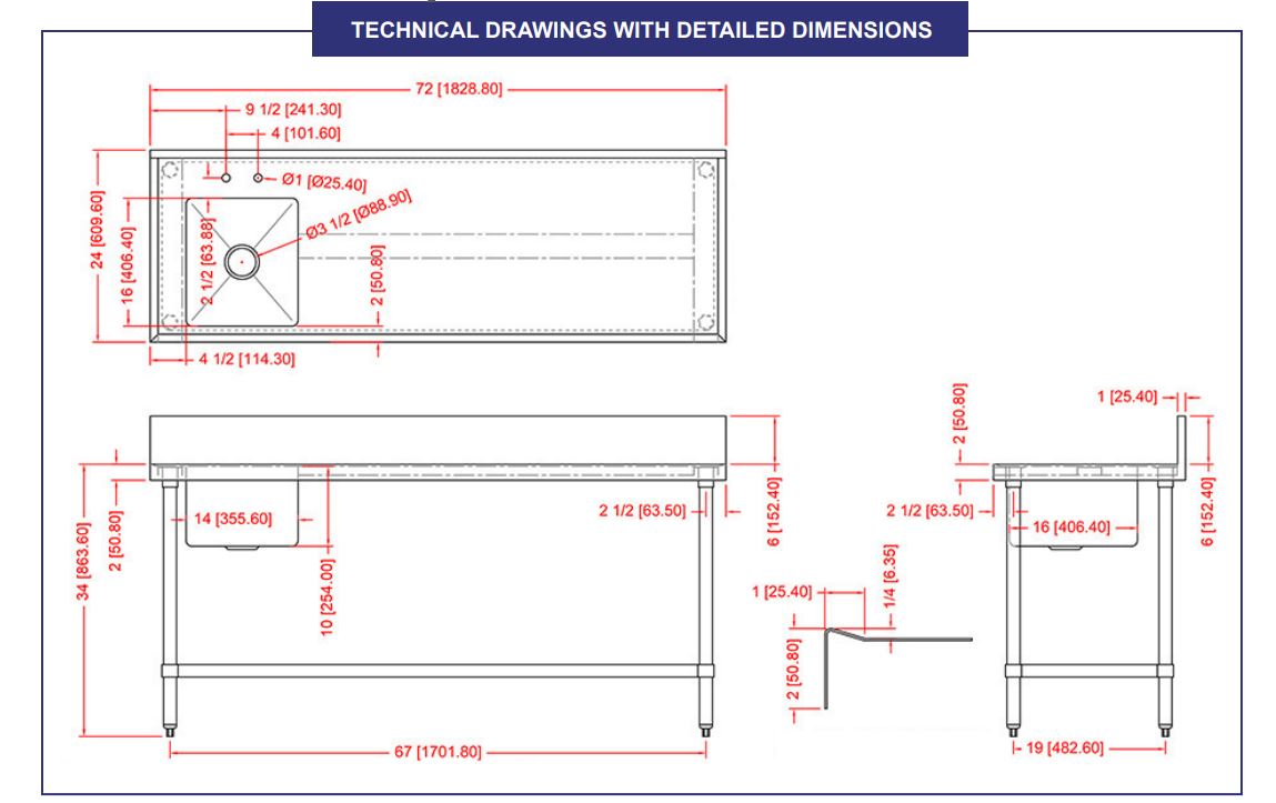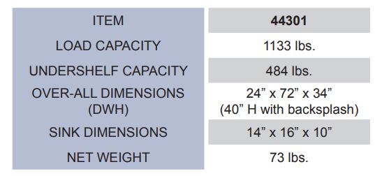 24″ x 72″ All Stainless Steel Table with Left Sink and 6″ Backsplash 44301 Features: