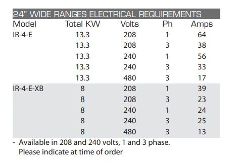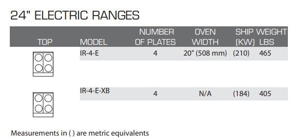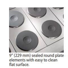 The IR-4-E electric range has four burners, and so food and debris won’t spill into the burner, these elements are sealed. It’s also easier to move pans over sealed burners than open ones, and to maximize contact with large pans, the elements have a diameter of 9 inches.