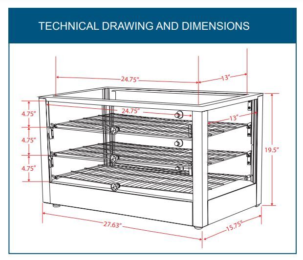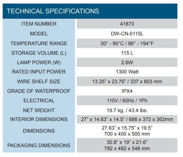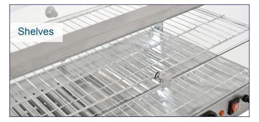 Serve your customers fresh, warm products with Omcan’s DW-CN-0080L and DW-CN-0115L display warmers. Perfect for convenience stores, cafes, and small delis. They feature stainless steel construction with hinged glass doors. They also have adjustable temperature controllers to precisely control the best temperature for your foods. Non-adjustable chrome plated shelves included.