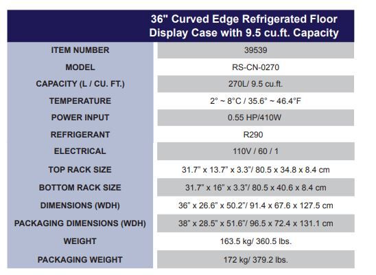 Efficient Power Management: Designed for efficiency, this display case operates at just 0.55 HP (410 W), making it an environmentally-friendly and cost-effective choice for your business. With a reliable 110V / 60Hz / 1Ph electrical system, you can trust that your delectables will stay at the perfect temperature.