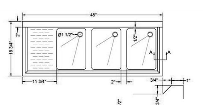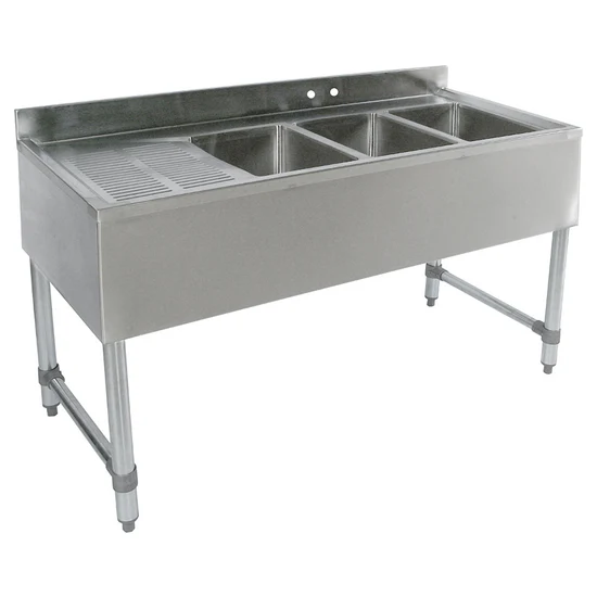 The EFI 48″ x 18″ x 10″ Corner Drain Three Compartment Bar Sink (model SIB-3L) is engineered for high-efficiency use in bar and food service environments. Constructed from 18-gauge Type 304 stainless steel, this sink offers exceptional durability and resistance to corrosion. It features three spacious compartments, each with a depth of 10 inches, perfect for washing glassware and utensils. The sink is designed with a left drain board, providing additional space for drying and preparation. Its coved corners ensure easy cleaning, while the die-stamped drain boards promote effective drainage, making it an ideal choice for busy commercial kitchens.