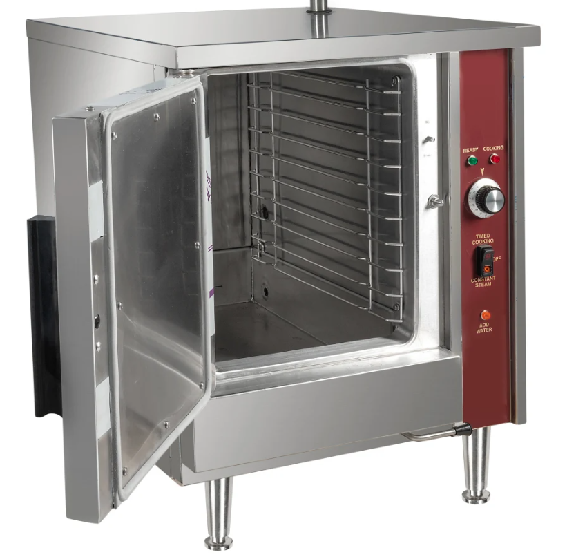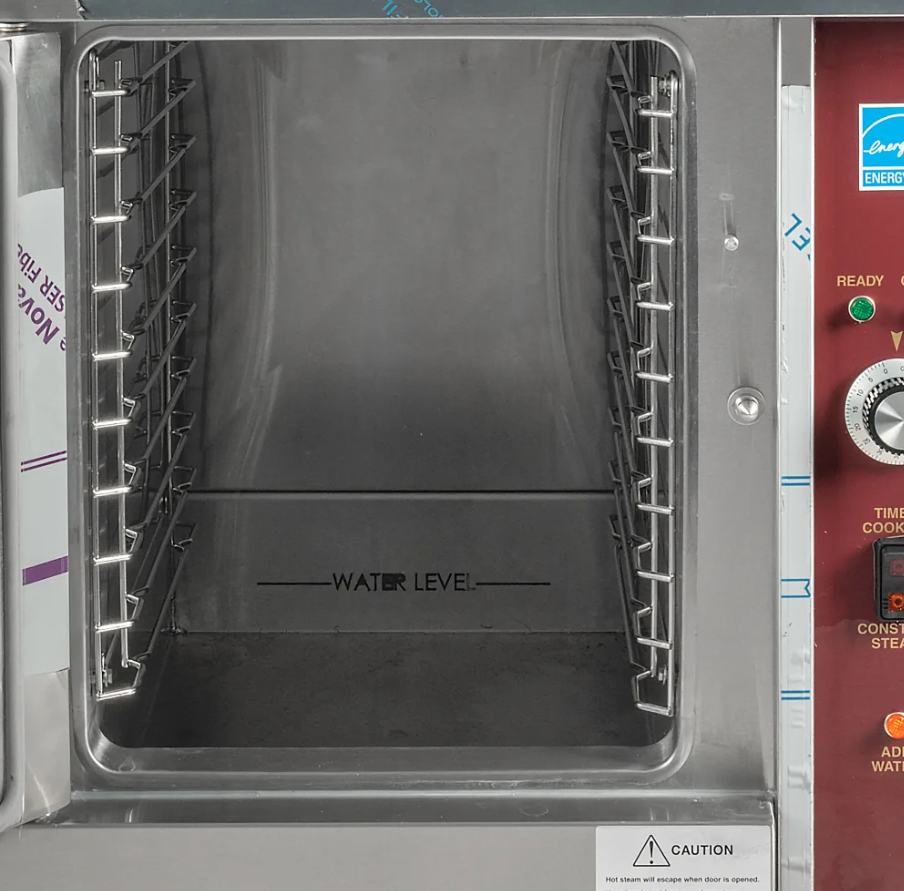 The SX-5G3 is a gas-fired convection steamer with a stainless steel steam generator and a 5-pan capacity. It is constructed with satin finish 304 stainless steel, and the cooking chamber is made from one-piece welded 316 stainless steel with coved corners. The heavy-duty door features a stainless steel inner liner with a full perimeter gasket seal, an outer welded stainless steel liner, and a positive lock and seal mechanism with spring release. The compartment includes removable stainless steel pan supports and a drip trough connected to the drain to collect condensate when the door is opened.