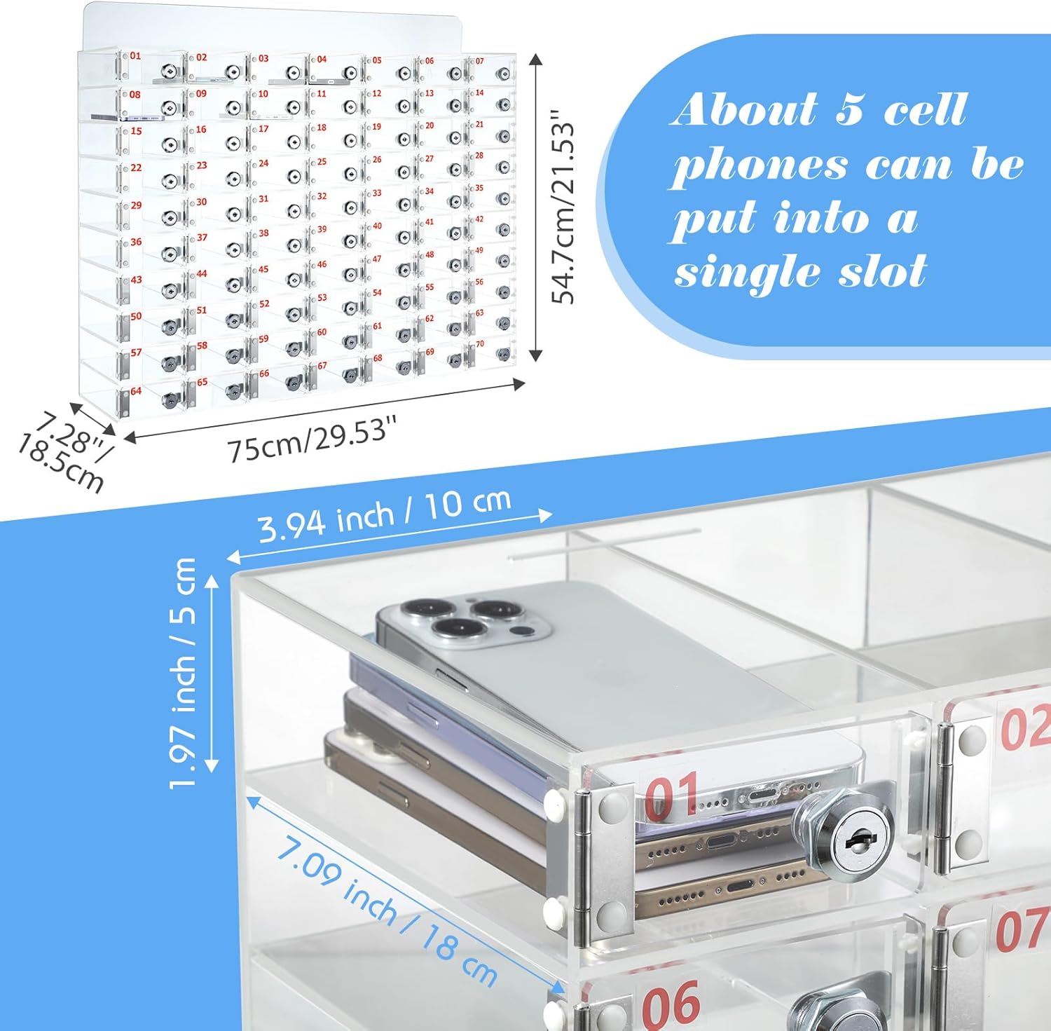Each small cell of acrylic cellphone box: approx. 7.09 x 3.94 x 1.97 inches/ 18 x 10 x 5 cm