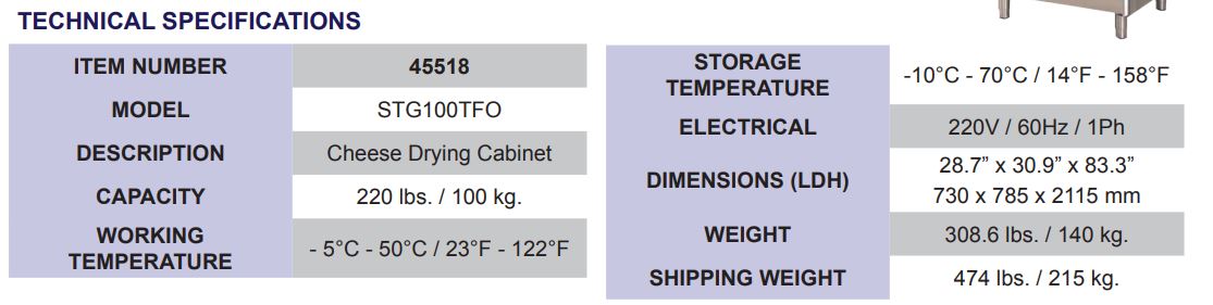 Affinacheese® has been designed specifically for drying/seasoning of all types of cheeses. All internal and external parts that may come in contact with food are built using AISI 304 stainless steel.
