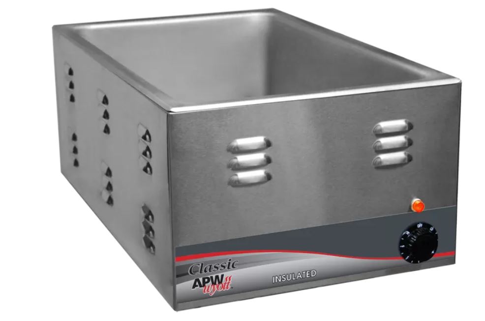 The 22 qt XPert Classic Full Size Countertop Food Warmer by APW Wyott is perfect for serving hot dogs, french fries, and more. Its robust stainless steel construction is insulated with fiberglass to prevent heat buildup on interior components and surfaces. includes robust wiring for even heat distribution.