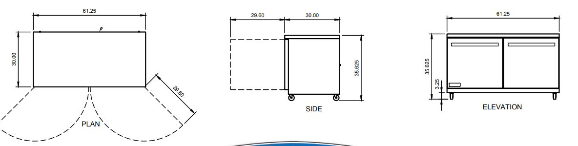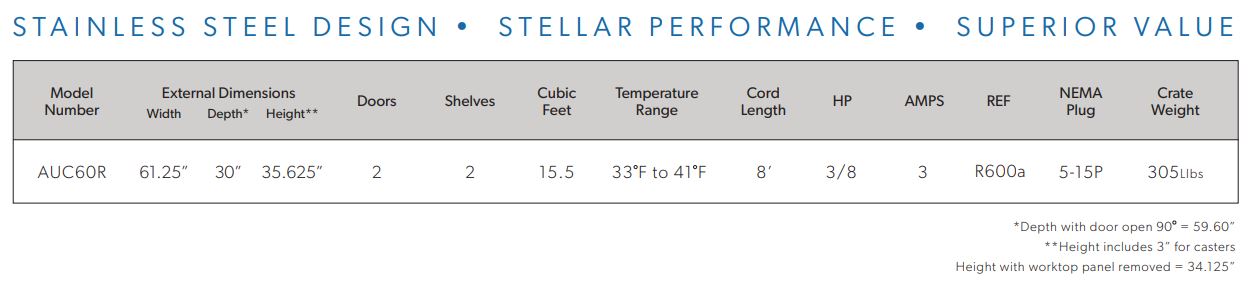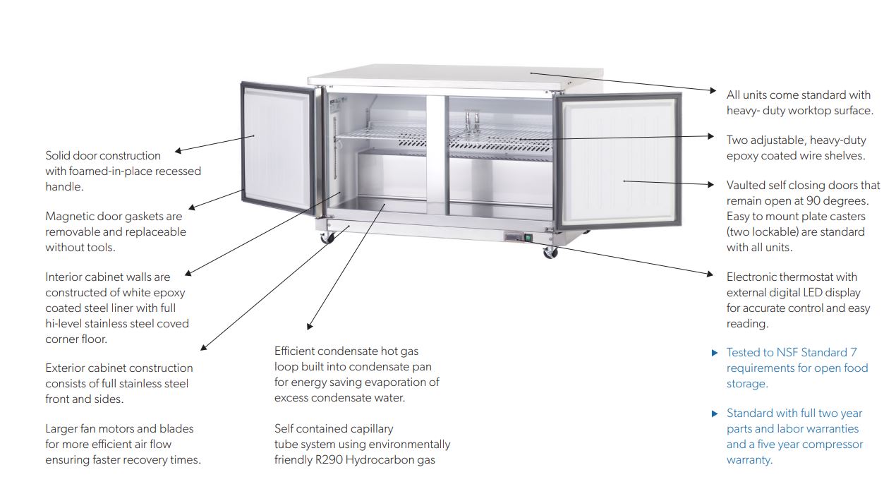 The exterior of our under-counter models are beautifully designed in a smooth stainless-steel finish for a professional look that you would find hard to limit in any commercial application. More importantly, our products have many features that are desired in today’s commercial foodservice market. Features that include an inner door liner that is constructed of a hi-impact ABS polymer with an irregular shaped surface along with a vaulted design that extends beyond the door opening when shut, this door liner allows the end user lower compressor run times over the life of the unit due to its irregular surface working in conjunction with the vaulted door liner, other features include hi-grade stainless steel floor with coved corners, high output yet electrically efficient fan motors, electronic micro-processing digital temperature control with external digital display.