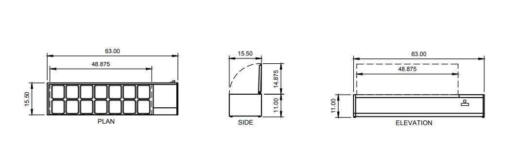 External Dimensions: 63″ W x 15.5″ D x 11″ H