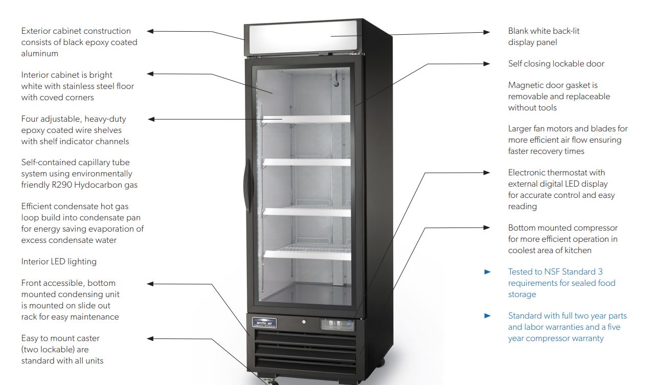 Arctic Air’s glass door reach-in Merchandiser refrigerators and freezers are designed to bring you real, commercial-grade performance at a truly incredible value. All Arctic Air commercial products are tested to NSF levels and must pass numerous quality control inspections throughout the manufacturing process.