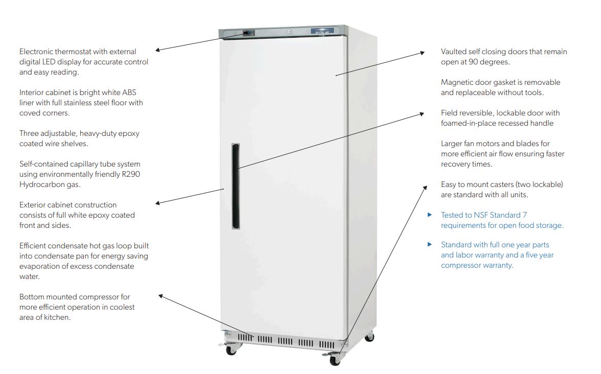 The exterior of our economy reach-in models are designed in a smooth white epoxy coated aluminum surfaces for a professional and clean look. More importantly, our products have many features that are desired in today’s commercial foodservice market. Features that include an inner door liner that is constructed of a hi-impact ABS polymer with an irregular shaped surface along with a vaulted design that extends beyond the door opening when shut. This door liner allows the end user lower compressor run times over the life of the unit due to its irregular surface working in conjunction with the vaulted door liner, other features include hi-grade stainless steel floor with coved corners, high output yet electrically efficient fan motors, electronic micro-processing digital temperature control with external digital display, bottom mounted condensing unit for easy maintenance/cleaning/servicing.