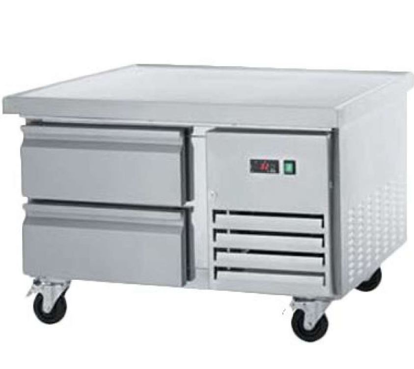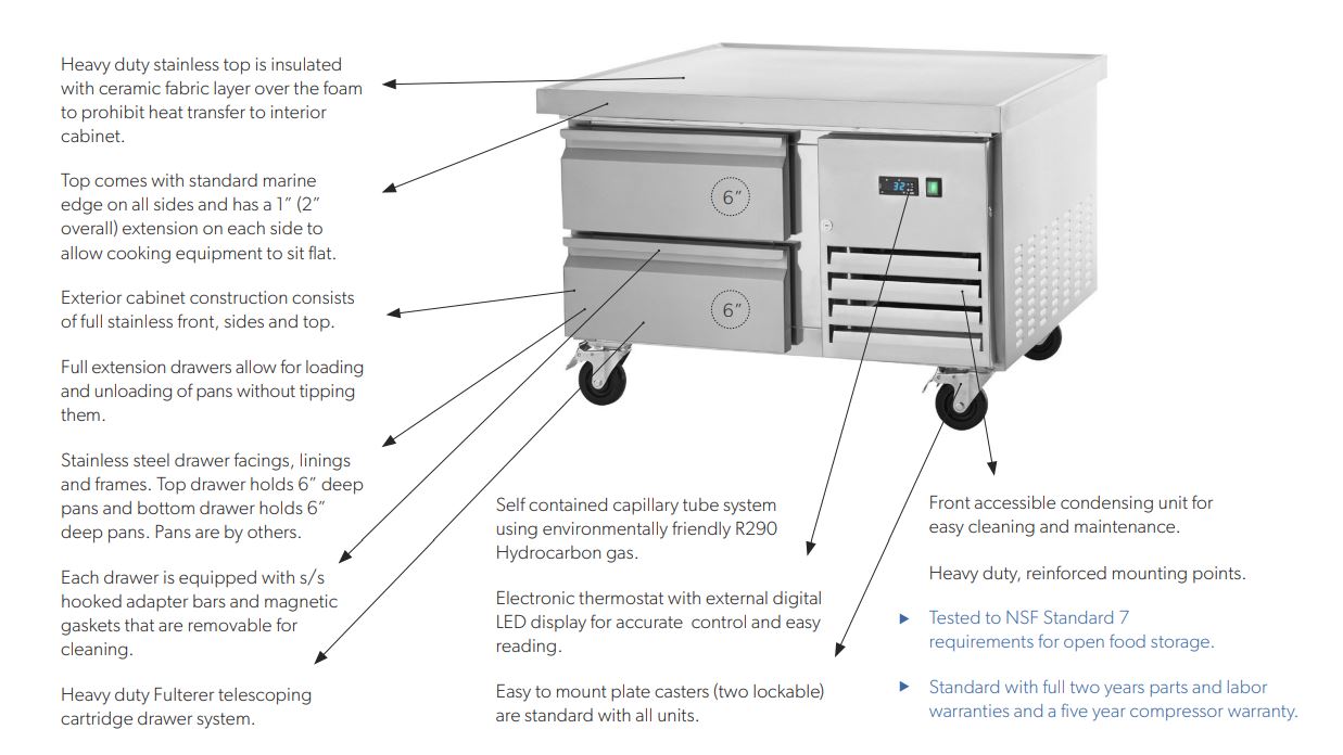 The exterior of our ref. chef base models are beautifully designed in a smooth stainless-steel finish for a professional look that you would find hard to limit in any commercial application. More importantly, our products have many features that are desired in today’s commercial foodservice market. Features that include a sub-layer ceramic mat that heavily reduces the heat transfer from the cooking appliance to the cold cabinet/the foam/and the mechanical compartment…this simple feature provides year-after-year of reliable performance, Fulterer™ heavy-duty/telescoping/cartridge style drawer slides/heavy-duty mounting points/full perimeter marine edge on top/drawer slides that will house 4” deep pans in the top drawers and 6” deep pans in the bottom drawers, high output yet electrically efficient fan motors, electronic micro-processing digital temperature control with external digital display, side mounted compressor along with a front accessible side mounted condensing unit for easy maintenance/cleaning/servicing.