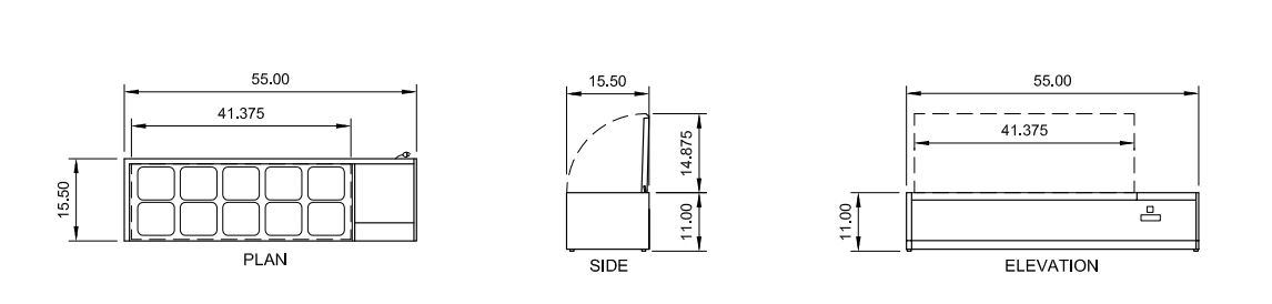 External Dimensions: 55″ W x 15.5″ D x 11″ H