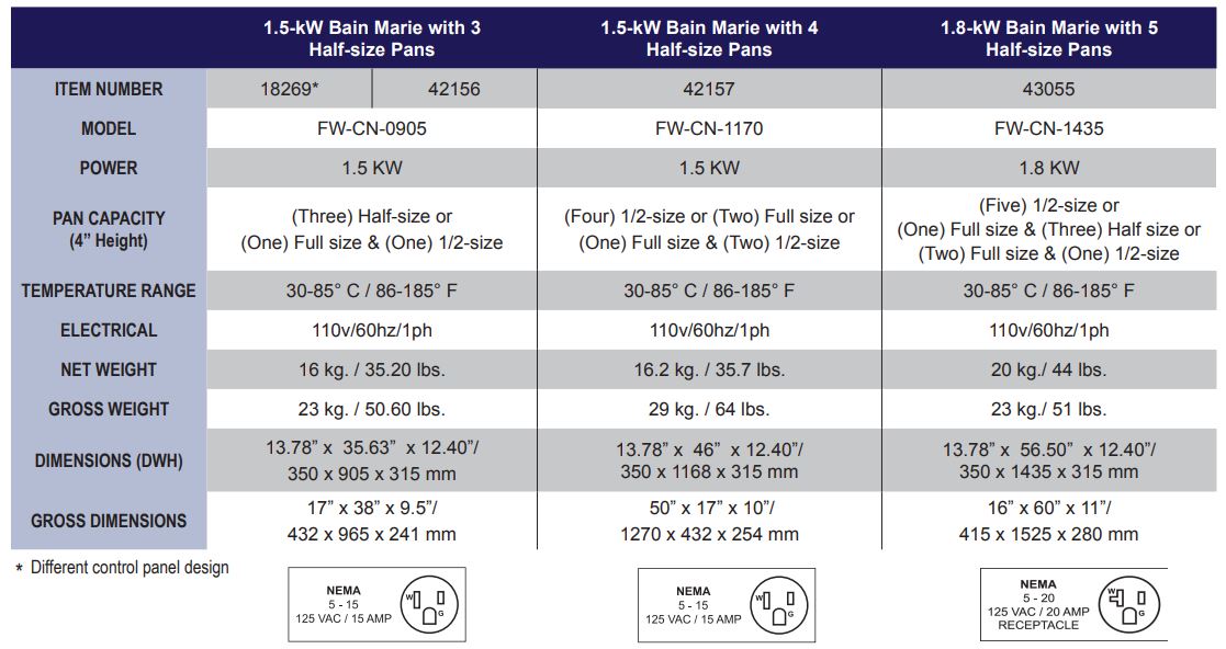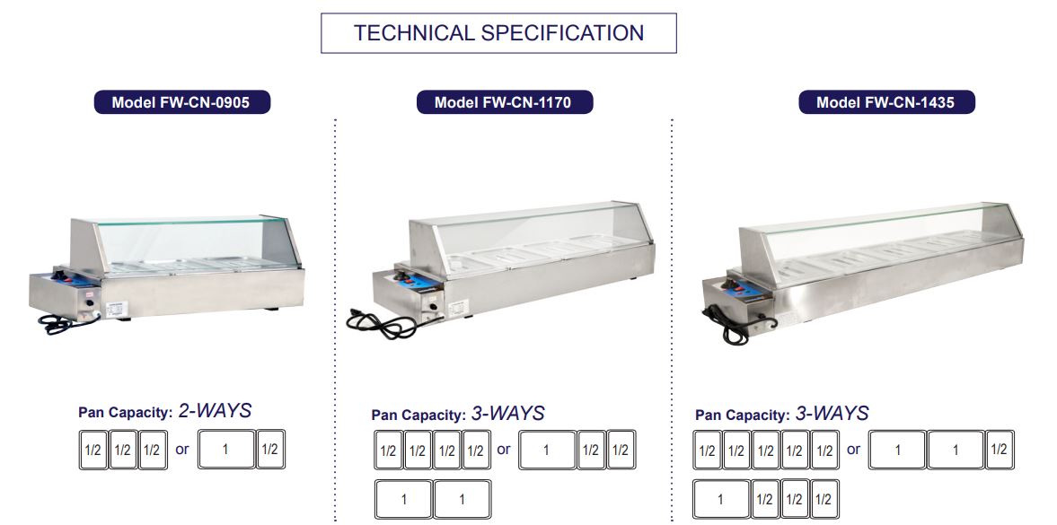 Our bain-maries are constructed with high quality stainless steel. They provide high-efficiency performance and are equipped with a thermostat. They all include glass sneeze guard, clear lids, and half-size pans. Can accommodate full-size pans in lieu of two half-size pans. These products are ideal for restaurants, hotels, banquet halls, and cafeterias.