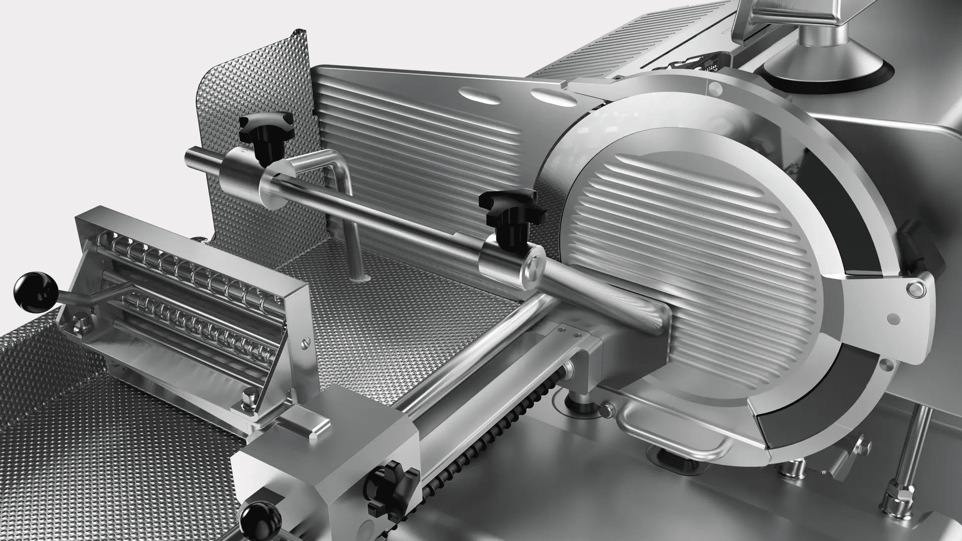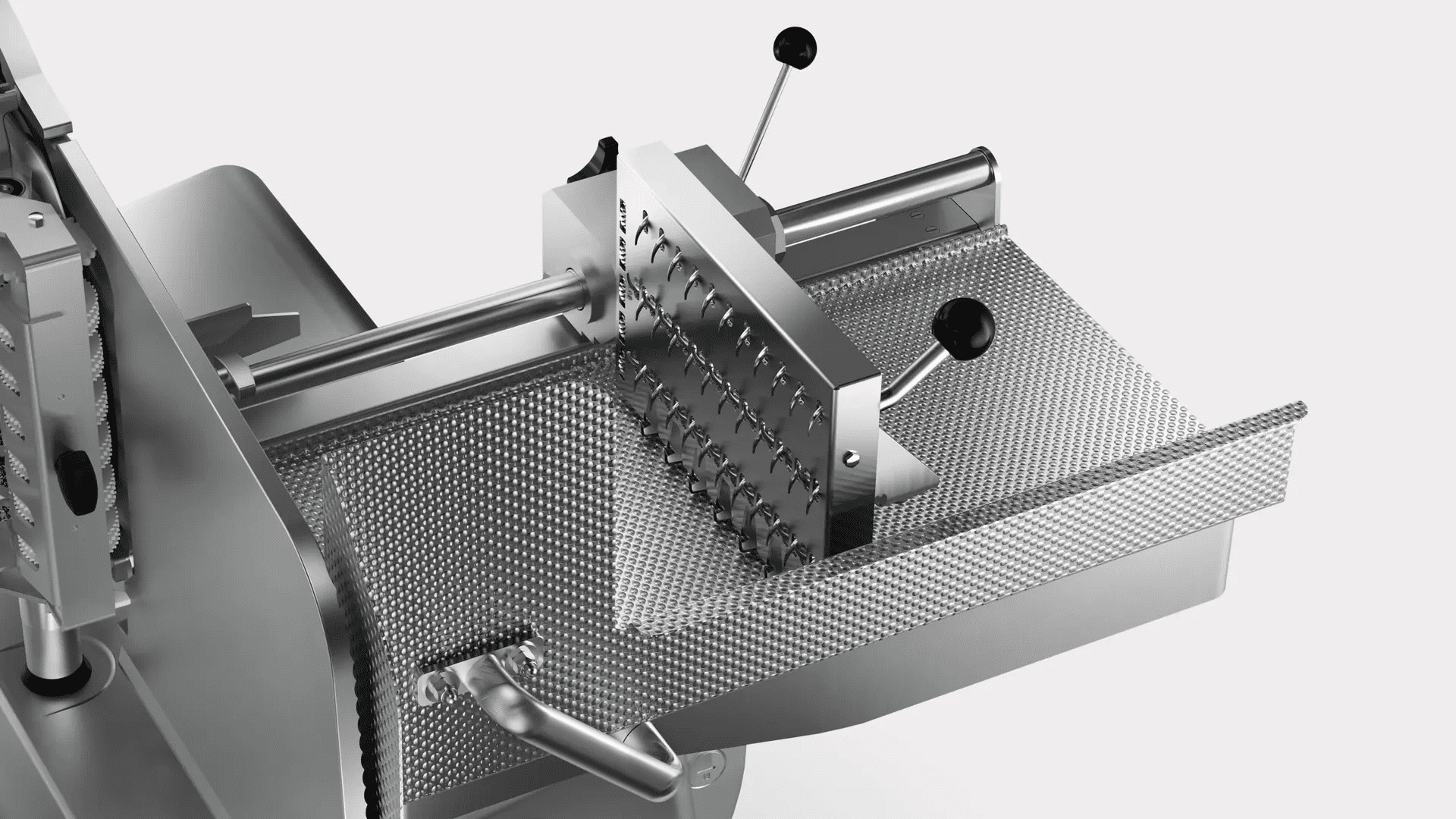 Vertical Slicing System, energy saving Emotion™ intelligent drive motor, maximum 80 strokes per minute, configurable touch display, digital slicing control, integrated portion scale for target weight control (range 50-2000g/1g), transport conveyor, 3-Portion stainless steel mesh belt, slice thickness adjustment 0.01 inch to 0.5 inch, product length 15-3/4″ (400mm) carriage, shaves, stacks (maximum height 3.5 inch/90 mm), shingles, circular pattern, 13″ grooved vacuum release blade, shaving deflector, IP rating IPx5, efficient cleaning with foam & hose, mobile stand with locking wheels, network ready, starter kit, first year SlicerGard™ Full Service Contract, 120v/60/1-ph, 5.8 amps, cord with NEMA 5-15P, CE, ETL, cETLus