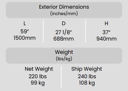Exterior Dimensions ( L x D x H ) 59 x 27 1/8 x 37 inch