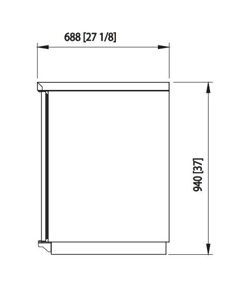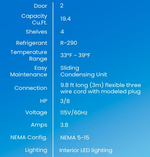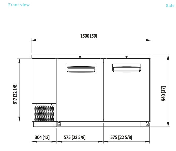 Back Bar Cooler, two-section, 59″W, side-mounted self-contained refrigeration, stainless steel top, (2) locking solid doors, (4) adjustable shelves, interior LED lighting, galvanized steel interior with stainless steel floor, black laminated exterior, R290 Hydrocarbon refrigerant, 3/8 HP, 115v/60/1-ph, 3.5 amps, cord with NEMA 5-15P, cUL, UL, ETL-Sanitation