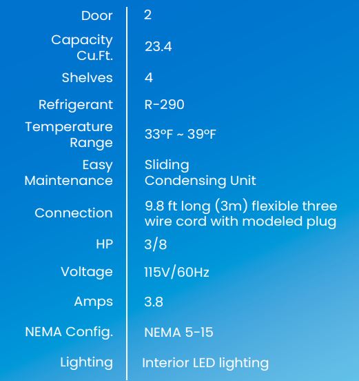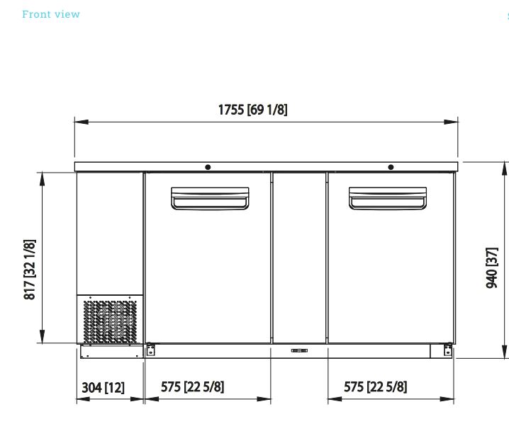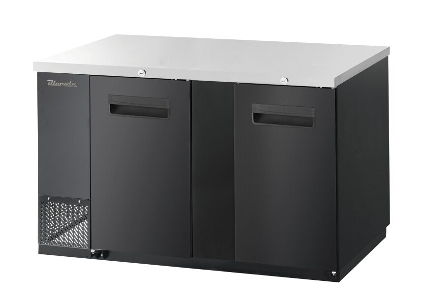 Back Bar Cooler, two-section, 69-1/8″W, side-mounted self-contained refrigeration, stainless steel top, (2) locking solid doors, (4) adjustable shelves, interior LED lighting, galvanized steel interior with stainless steel floor, black laminated exterior, R290 Hydrocarbon refrigerant, 3/8 HP, 115v/60/1-ph, 3.5 amps, cord with NEMA 5-15P, cUL, UL, ETL-Sanitation
