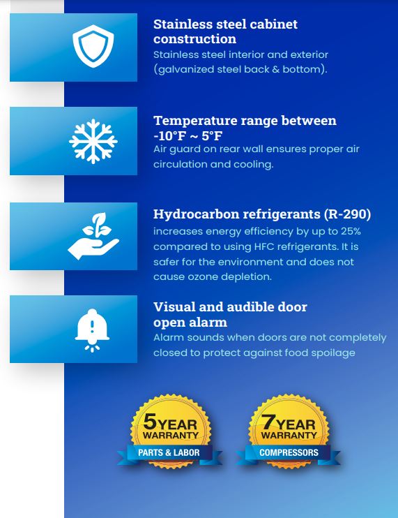This single-door unit is constructed with stainless steel interior and exterior so it always looks good and performs as it should. The door is made of heavy-duty metal and is covered with a lifetime guarantee! The evaporator is also electrodeposition-coated to avoid corrosion and improve heat transfer.