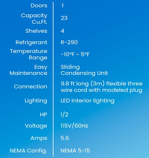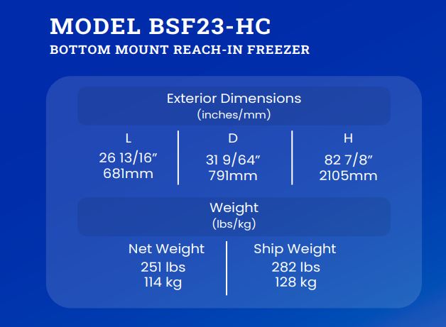 The Blue Air BSF23-HC Freezer is lit with LED for added energy efficiency and product visibility. You won’t ever have to deal with excess energy consumption when the door is accidentally left open after use, thanks to the self-closing door. It also stays open at 110° when you need to fill it up with bulks of items. It has pressure relievers that easily open and a lock to prevent theft during off-hours. This unit comes standard with a right-hinged door but left-hinge models are available.
