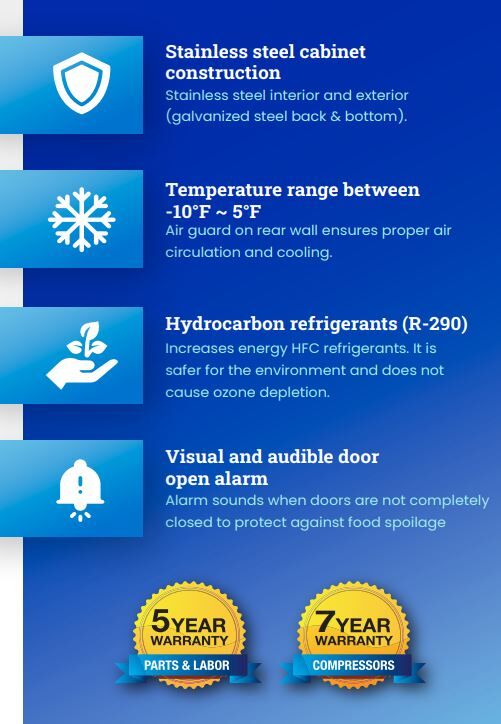 With solid stainless steel construction, this freezer won’t easily rust, dent, or scratch for consistent performance and enduring sleek appearance. All three (3) doors are made of heavy-duty metal and are covered with a lifetime guarantee! The electrodeposition coating on the evaporator further minimizes potential corrosion while also improving heat transfer in the unit.