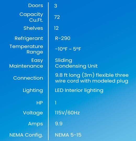 Freezer, reach-in, three-section, 72 cu. ft, capacity, bottom-mount self-contained refrigeration, (3) full-size solid self-closing doors (locking), metal door handles, door open alarm, (12) adjustable wire shelves, digital controls, LED interior lighting, stainless steel interior & exterior, 4″ swivel casters (2 braked), R290 Hydrocarbon refrigerant, 1 HP, 115v/60/1-ph, 9.9 amps, cord with NEMA 5-15P, cETLus, ETL-Sanitation, ENERGY STAR®