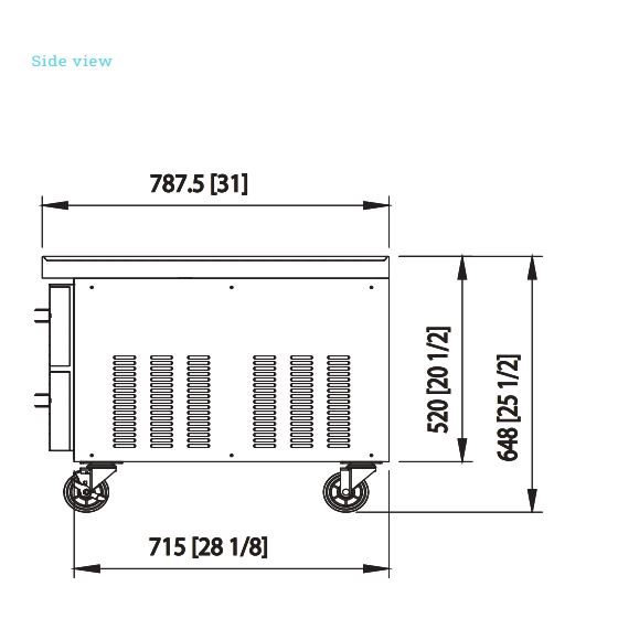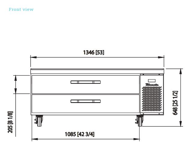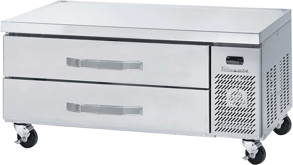 Refrigerated Chef Base Equipment Stand, 53″W, side-mounted self-contained refrigeration, stainless steel top with marine edge, (2) drawers, automatic defrost, stainless steel interior, stainless steel front & sides, (4) 4″H swivel casters (2 braked), R290 Hydrocarbon refrigerant, 1/4 HP, 115v/60/1-ph, 3 amps, cord with NEMA 5-15P, cUL, UL, ETL-Sanitation