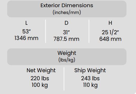 Exterior Dimensions ( L x D x H ) 53 x 31 x 25 1/2 inch
