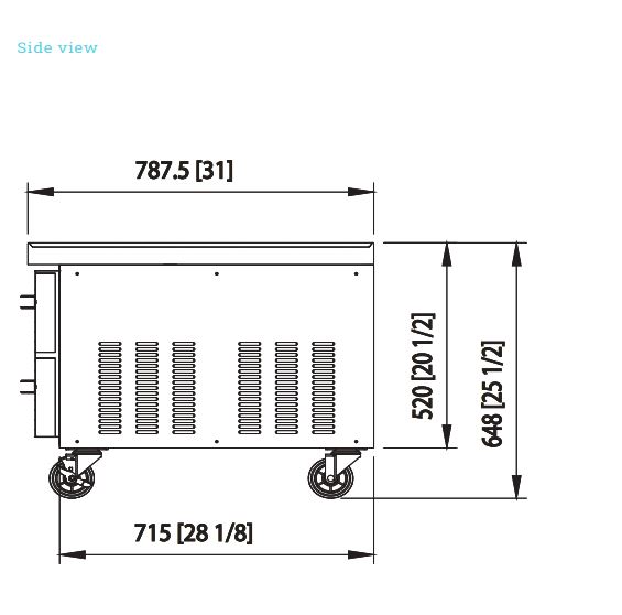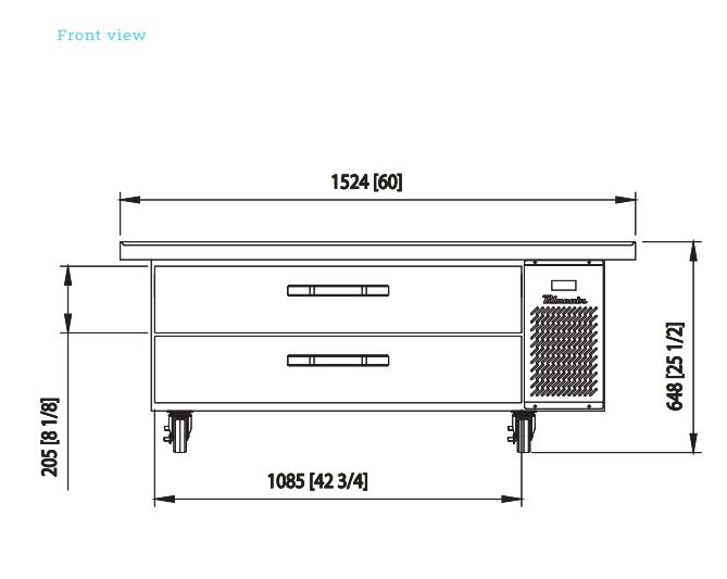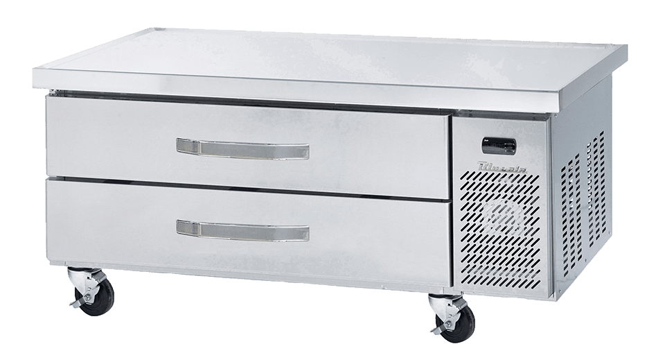 Refrigerated Chef Base Equipment Stand, 60″W, side-mounted self-contained refrigeration, stainless steel top with marine edge, (2) drawers, automatic defrost, stainless steel interior, stainless steel front & sides, (4) 4″H swivel casters (2 braked), R290 Hydrocarbon refrigerant, 1/4 HP, 115v/60/1-ph, 3 Amps, cord with NEMA 5-15P, cUL, UL, ETL-Sanitation