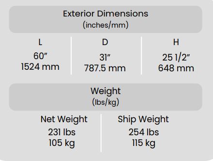 Exterior Dimensions ( L x D x H ) 60 x 31 x 25 1/2 inch