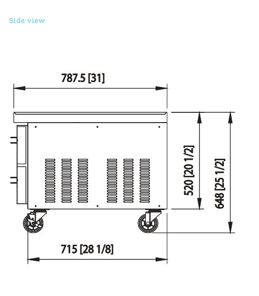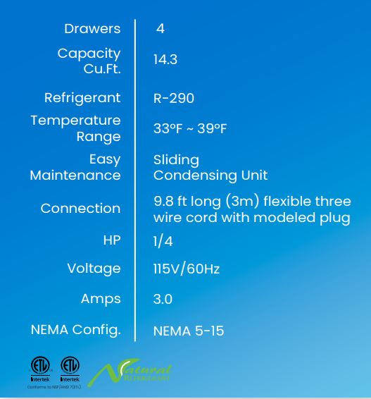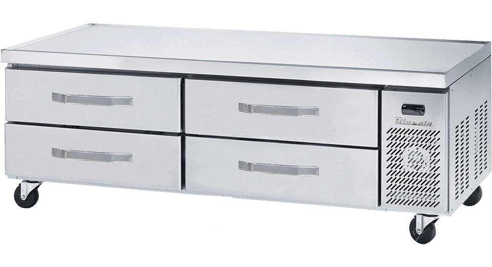 Refrigerated Chef Base Equipment Stand, 74-1/8″W, side-mounted self-contained refrigeration, stainless steel top with marine edge, (4) drawers, automatic defrost, stainless steel interior, stainless steel front & sides, (6) 4″H swivel casters (2 braked), R290 Hydrocarbon refrigerant, 1/4 HP, 115v/60/1-ph, 3 amps, cord with NEMA 5-15P, cUL, UL, ETL-Sanitation