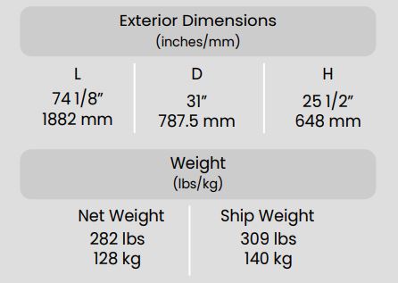 Exterior Dimensions ( L x D x H ) 74 1/8 x 31 x 25 1/2 inch