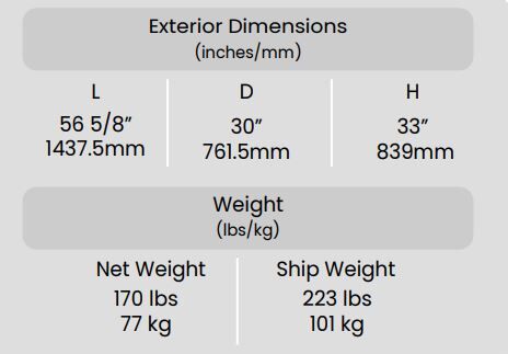 Exterior Dimensions ( L x D x H ) 56 1/8 x 29 5/8 x 33 1/8 inch