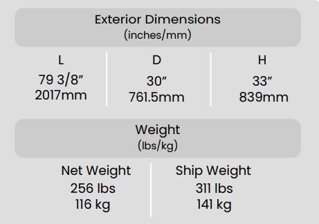 Exterior Dimensions ( L x D x H ) 79 3/4 x 29 5/8 x 33 1/8 inch