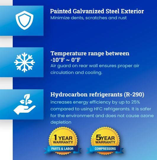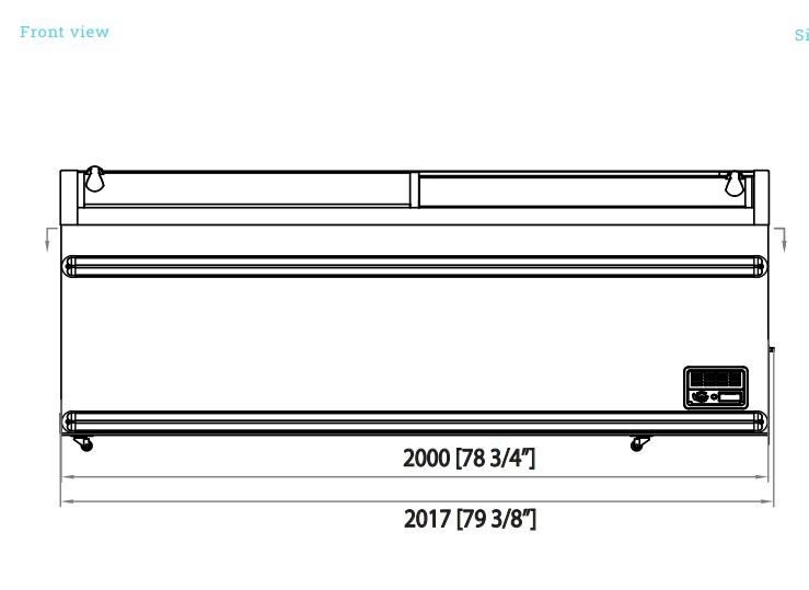 Ice Cream Merchandiser/Chest Freezer, 79-3/8″W x 30″D x 33″H, bottom mounted self-contained refrigeration, 24.72 cu. ft., digital temperature controls, temperature range -10°- 0°F, (2) locking sliding tempered glass doors, (6) epoxy coated wire baskets, interior LED lighting, manual defrosting, drain hole, painted galvanized exterior, aluminum interior, casters, R290 Hydrocarbon refrigerant, 3/4 HP, 3.8 amps, 115v/60/1-ph, cord, NEMA 5-20P, cETLus, ETL-Sanitation