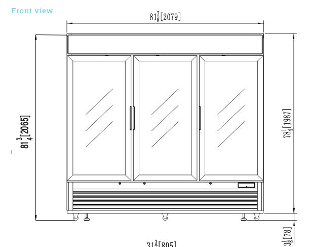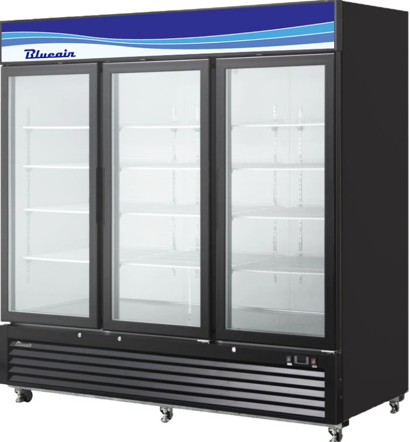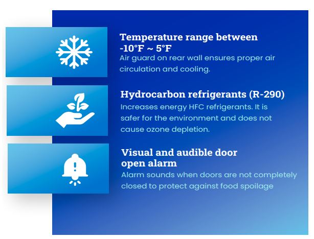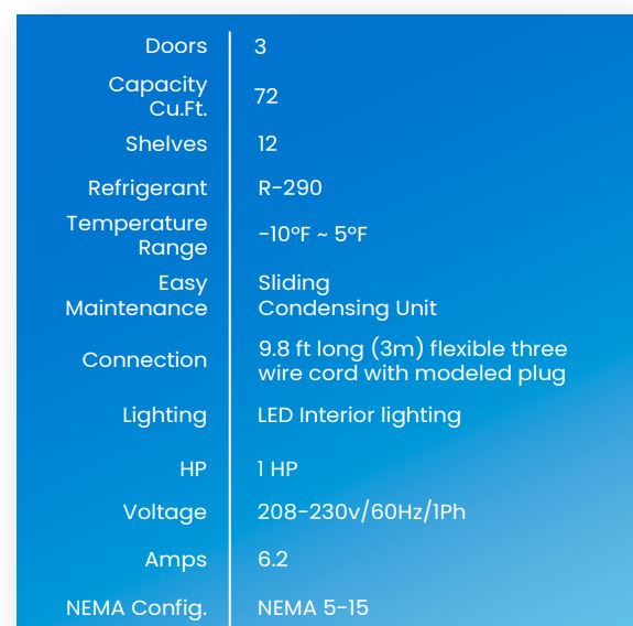 Freezer Merchandiser, three-section, 72 Cu. Ft. capacity, bottom-mount self-contained refrigeration, (3) self-closing aluminum frame hinged glass door (locking), (12) adjustable white epoxy coated wire shelves with trim, recessed handles, digital display & temperature control, LED interior lighting, backlit graphic panel, black painted steel exterior and trim, white painted steel interior, (6) 2-1/2″ casters (2 braked), CFC-Free, R290 Hydrocarbon refrigerant, 1 HP, 115v/230v/60/1-ph, 6.2 amps, cord with NEMA L14-20P, cETLus, ETL-Sanitation