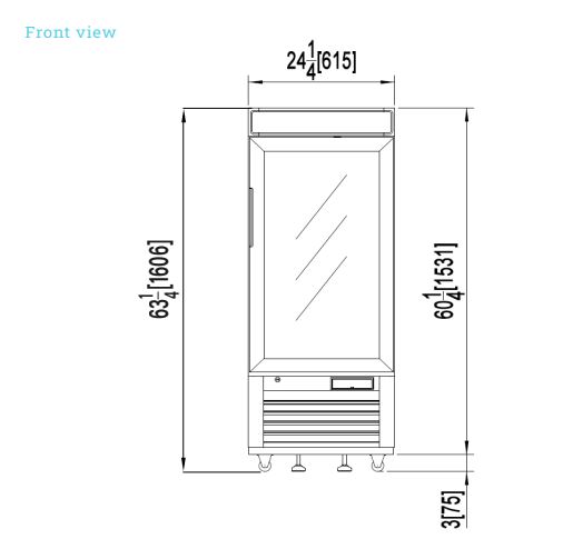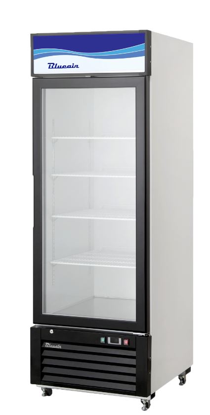 Refrigerated Merchandiser, one-section, 12 cu. ft. capacity, bottom-mount self-contained refrigeration, (1) double pane hinged glass door (locking), (4) adjustable epoxy coated wire shelves, LED interior lighting, backlit graphic panel, digital monitoring system, white painted steel interior & exterior, black exterior trim, (4) 2-1/2″ casters (2 braked), R290 Hydrocarbon refrigerant, 1/7 HP, 115v/60/1-ph, 2.1 amps, cord, NEMA 5-15P, cETLus, ETL-Sanitation