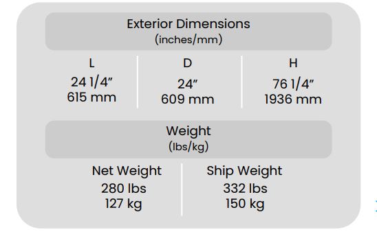 Exterior Dimensions ( L x D x H ): 24 1/4 x 24 x 76 1/4 inch