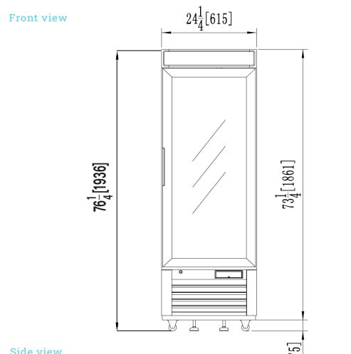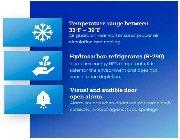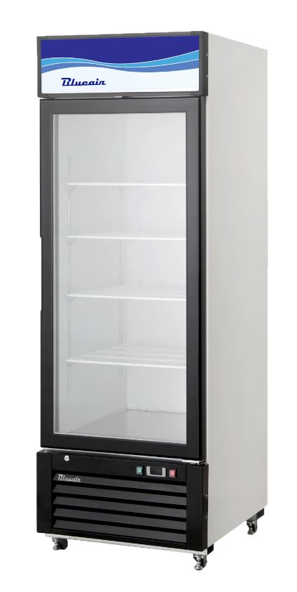 Refrigerated Merchandiser, one-section, 14 cu. ft. capacity, bottom-mount self-contained refrigeration, (1) double pane hinged glass door (locking), (4) adjustable epoxy coated wire shelves, LED interior lighting, backlit graphic panel, digital monitoring system, white painted steel interior & exterior, black exterior trim, (4) 2-1/2″ casters (2 braked), R290 Hydrocarbon refrigerant, 1/7 HP, 115v/60/1-ph, 2.1 amps, cord, NEMA 5-15P, cETLus, ETL-Sanitation