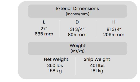 Exterior Dimensions ( L x D x H ): 27 x 31 1/2 x 81 3/4 inch