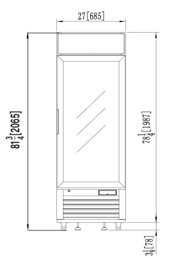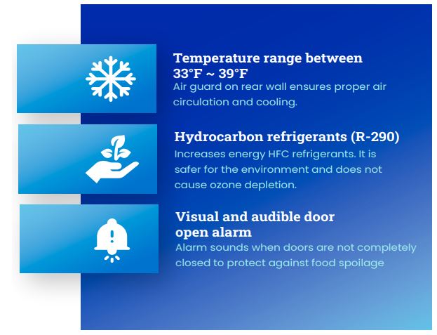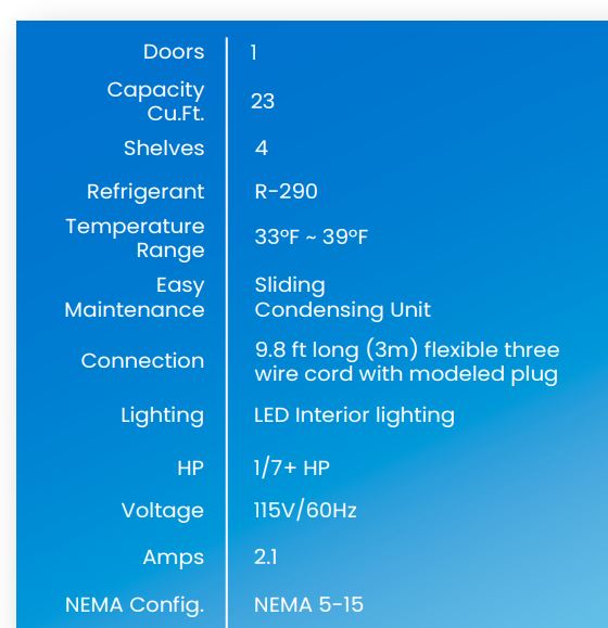 Refrigerated Merchandiser, one-section, 23 Cu. Ft. capacity, bottom-mount self-contained refrigeration, (1) double pane hinged glass door (locking), (4) adjustable epoxy coated wire shelves, LED interior lighting, backlit graphic panel, digital monitoring system, black painted steel exterior and trim, white painted steel interior, (4) 2-1/2″ casters (2 braked), R290 Hydrocarbon refrigerant, 1/7 HP, 115v/60/1-ph, 2.1 amps, cord, NEMA 5-15P, cETLus, ETL-Sanitation