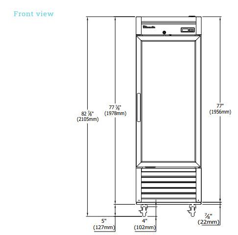 Refrigerator, reach-in, one-section, 23 cu. ft. capacity, bottom-mount self-contained refrigeration, (1) full-size self-closing glass door (locking), door open alarm, (4) adjustable wire shelves, digital controls, LED interior lighting, stainless steel interior & exterior, 4″ swivel casters (2 braked), R290 Hydrocarbon refrigerant, 1/4 HP, 115v/60/1-ph, 2.0 amps, cord with NEMA 5-15P, cETLus, ETL-Sanitation
