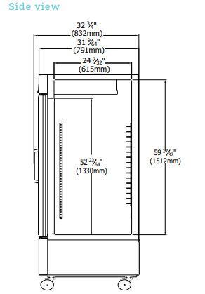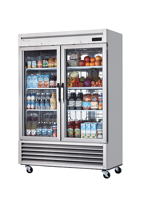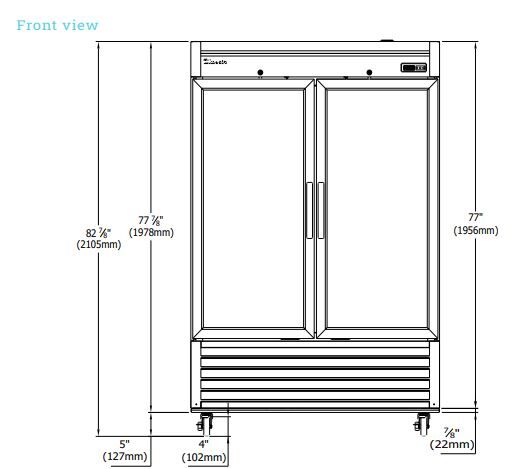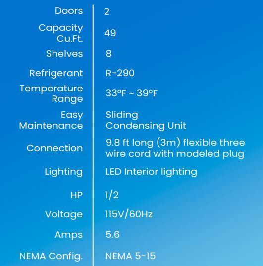 Refrigerator, reach-in, two-section, 49 cu. ft. capacity, bottom-mount self-contained refrigeration, (2) full-size self-closing glass doors (locking), door open alarm, (8) adjustable wire shelves, digital controls, LED interior lighting, stainless steel interior & exterior, 4″ swivel casters (2 braked), R290 Hydrocarbon refrigerant, 1/2 HP, 115v/60/1-ph, 5.6 amps, cord with NEMA 5-15P, cETLus, ETL-Sanitation