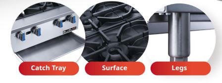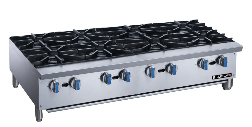 Hot Plate, countertop, heavy duty stainless steel construction, eight lift-off burner, gas.