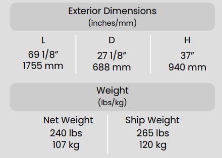 Exterior Dimensions ( L x D x H ) 69 1/8 x 27 1/8 x 37 inch