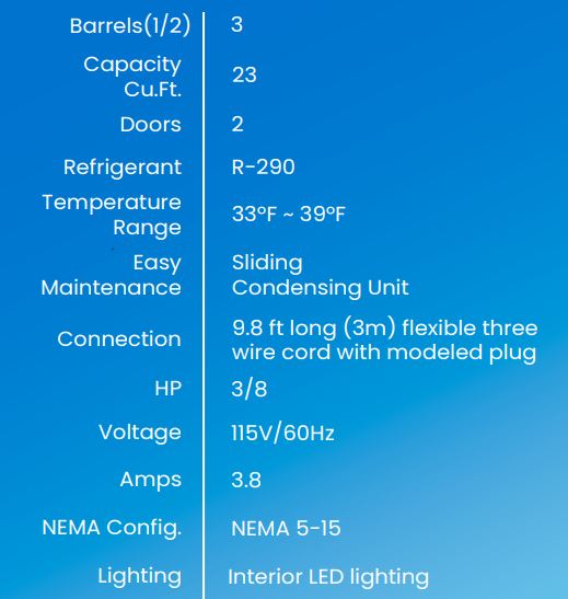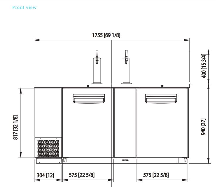 Keg Cooler, 69-3/8″W, side-mounted self-contained refrigeration, stainless steel top, (2) locking doors with recessed handles, (3) 1/2 barrels capacity, (1) 3″ dia. stainless steel insulated beer columns with single faucet, (1) 3″ dia. stainless steel insulated beer columns with double faucet, interior LED lighting, automatic defrost, galvanized steel interior with stainless steel floor, black laminated exterior, R290 Hydrocarbon refrigerant, 3/8 HP, 3.5 amps, 115v/60/1-ph, NEMA 5-15P, cUL, UL, ETL-Sanitation